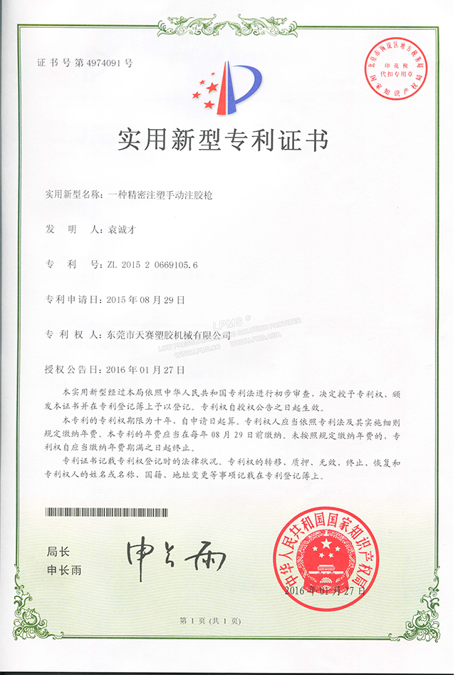 一種精密注塑手動注膠槍 (LPMS 100) 專案(àn)號(hào):2015206691056