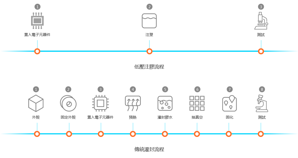 傳統高壓(yā)注(zhù)膠工藝中,注膠壓(yā)力大,因此在注膠過程中脆弱的精密元器件易損壞,導致生產過程中的次品率居高不下。